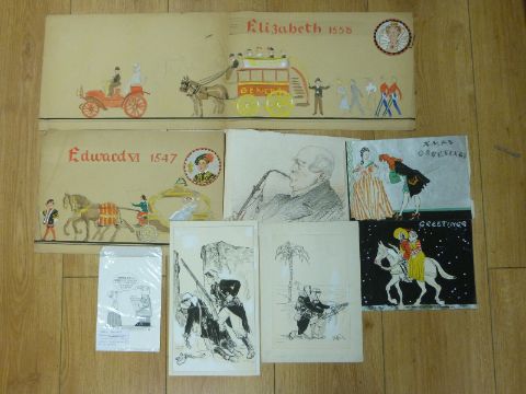 Neil Bennett pen and ink cartoon, colour designs for christmas greeting cards by Helen McKie, fold-out watercolour of Royal Procession, two pen & ink illustrations of Legionnaires in the desert, signed by the artist