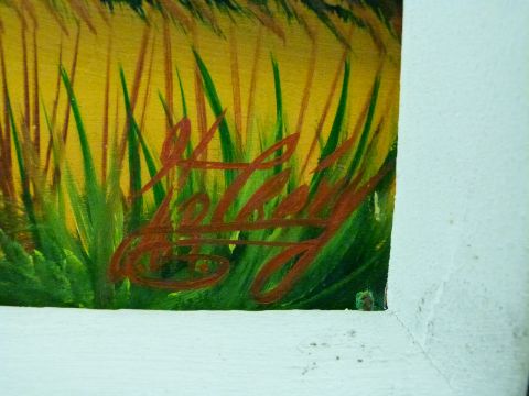 Modern acrylic on board people carrying novelty oversize fruit in a landscape, indistinctly signed lower right possibly Tolroy, 38 x 59.5cm
