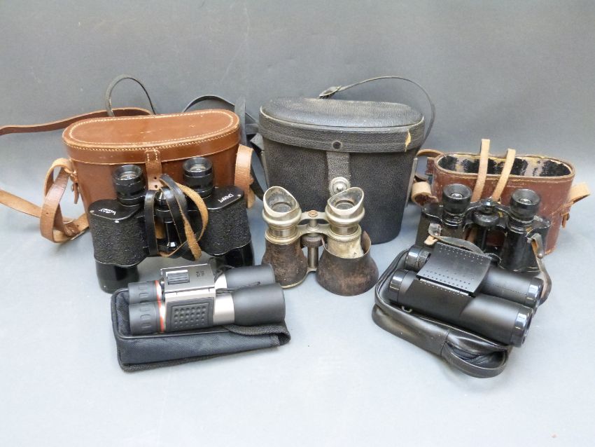 A cased pair of Wray of London 10x35mm "Defiant" binoculars, two modern pairs and 1930's field glasses