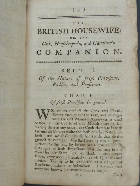 The British Housewife: or the Cook, Housekeeper's and Gardiner's Companion by Mrs. Martha Bradley with a Frontispiece engraving. Printed for S. Crowder and H. Woodgate. Leather boards with raised bands