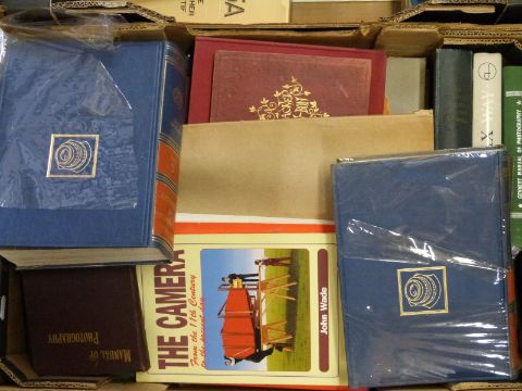 Two boxes of camera and photography interest books, lens hoods and Nikon boxes