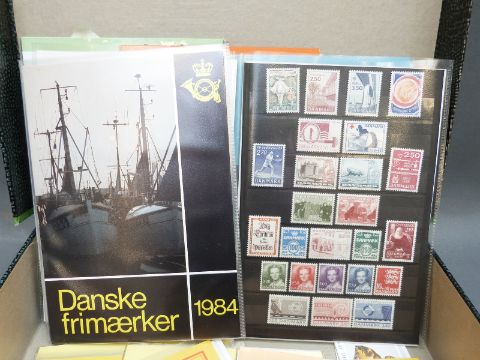 A box file with year packs and booklets of mint stamps from Denmark, Norway and Sweden