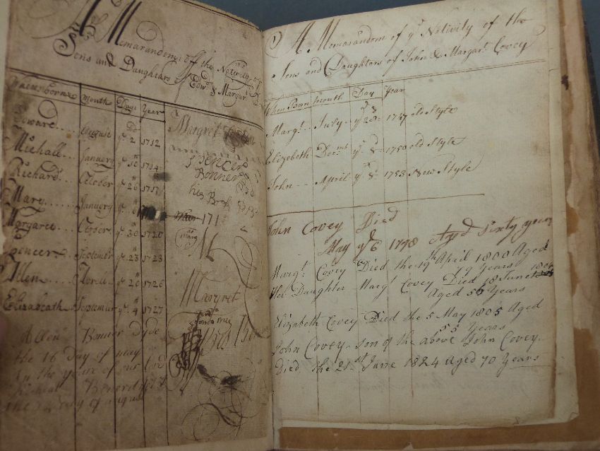 [King James Bible] Conteyning the Old Testament and the New. Newly Translated out of the original tongues & with the Former Translations diligently compared and revised by his Magesties speciall Comandement…with Genealogies and a map, imprinted at London by Robert Barker printer to the King, Engraved Anno Dom, 1612. Bound in leather with handwritten family records & history, and further inscription detailing its presentation as a gift in 1728.