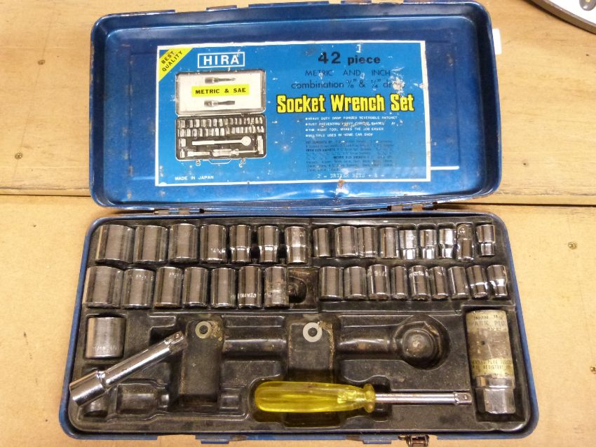A cased trolley jack and two socket sets