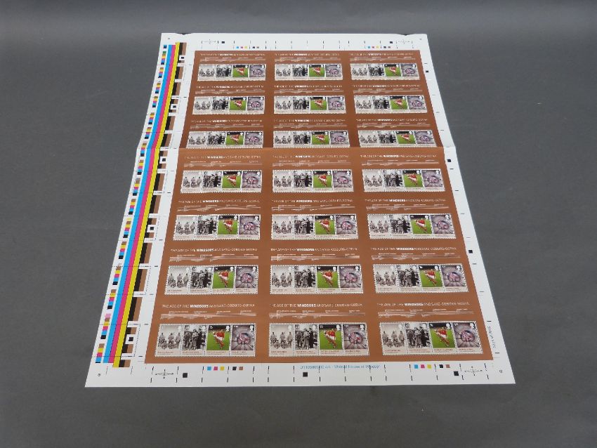 Two complete uncut press sheets of GB mini sheet stamps - 2012 House of Windsor and 2013 British Auto Legends in a protective plastic sleeve. Also a folder with collectable smiler sheets