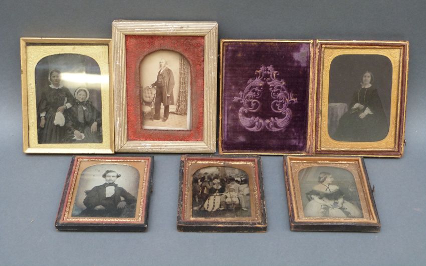 Six daguerreotype or similar early photographs, some in frames and folding case