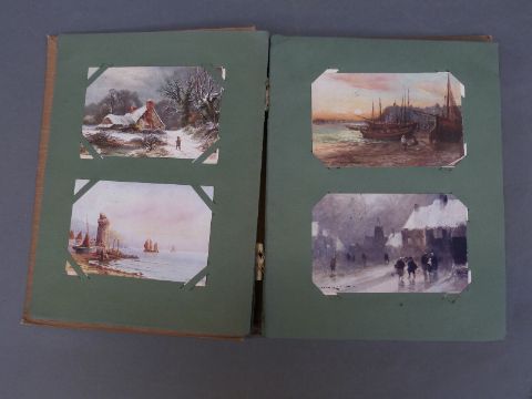An Edwardian postcard album of sailing scenes, rural/pastoral, Oxford Colleges and street scenes, Venetian night skylines, Nelson scenes, classic beauties, St Giles fair, River Ouse, approximately 63 cards