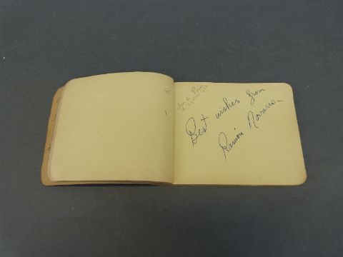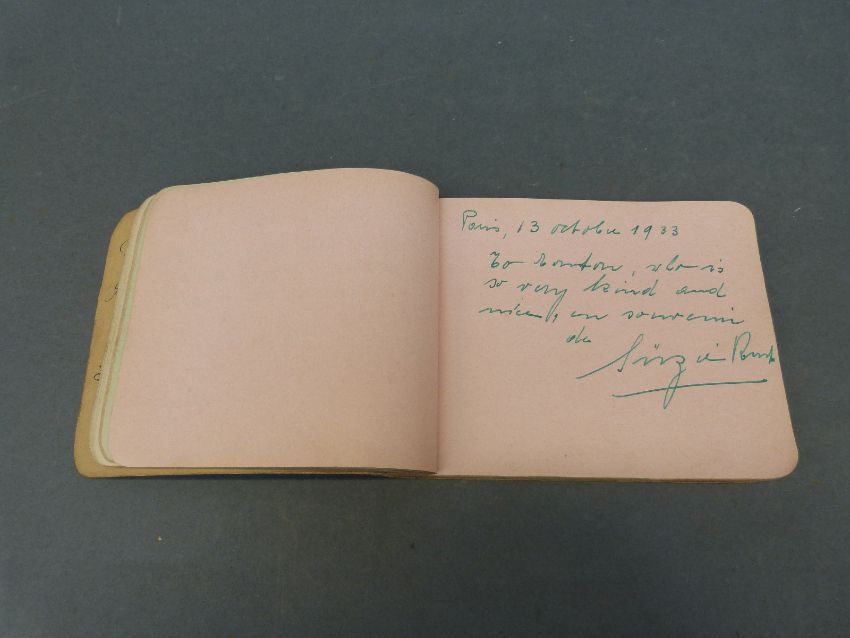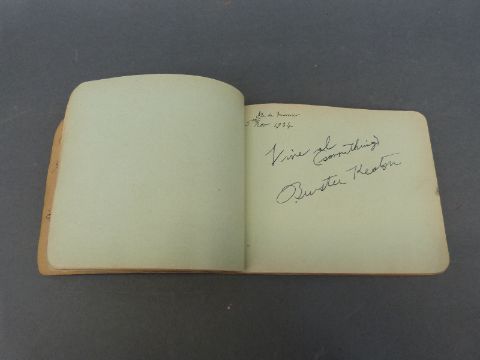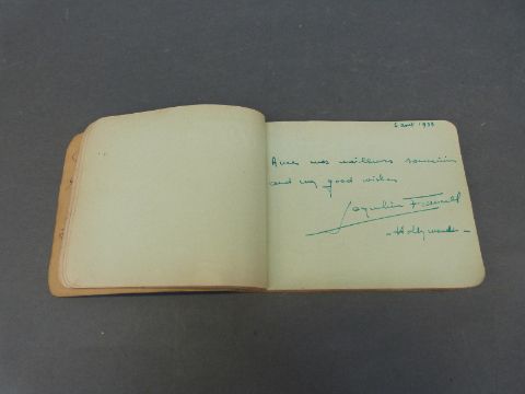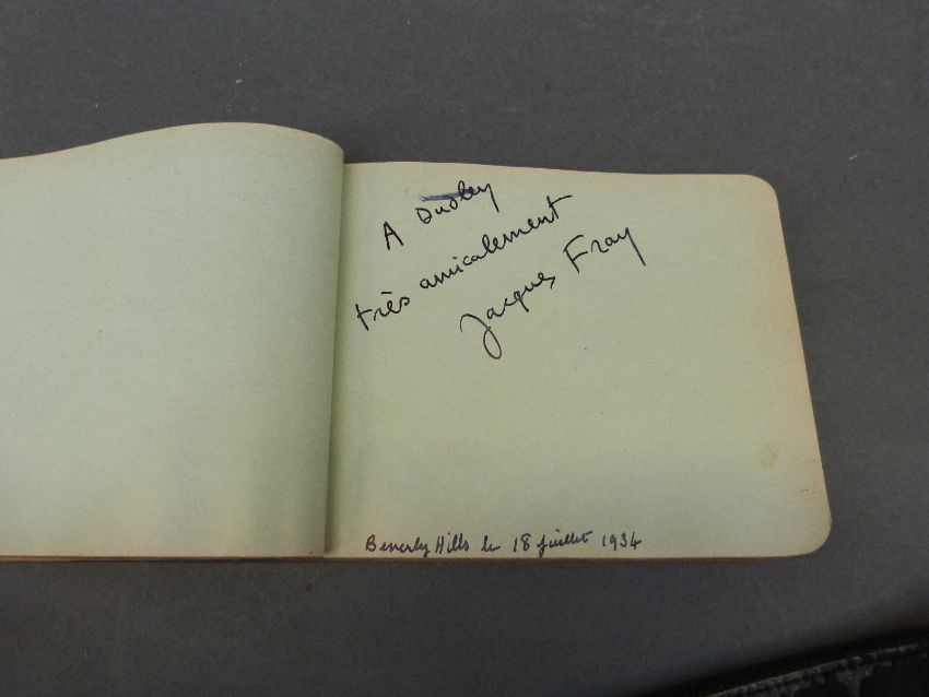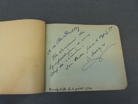 An autograph album dating to the 1930's and 40's, many entries from actors and guests at the Casino de Paris, others from Hollywood and Beverly Hills. Included are Buster Keaton, Harpo Marx, Maurice Chevalier, Edouard Herriot, Helene Robert, Jimmy McLarnin (boxer), Gary Leon and Marcia Mace, Jack Pearl 'The Baron', Marbeth Wright, Roman Novarro, Georges Carpentier (boxer and WWI pilot) and many more.