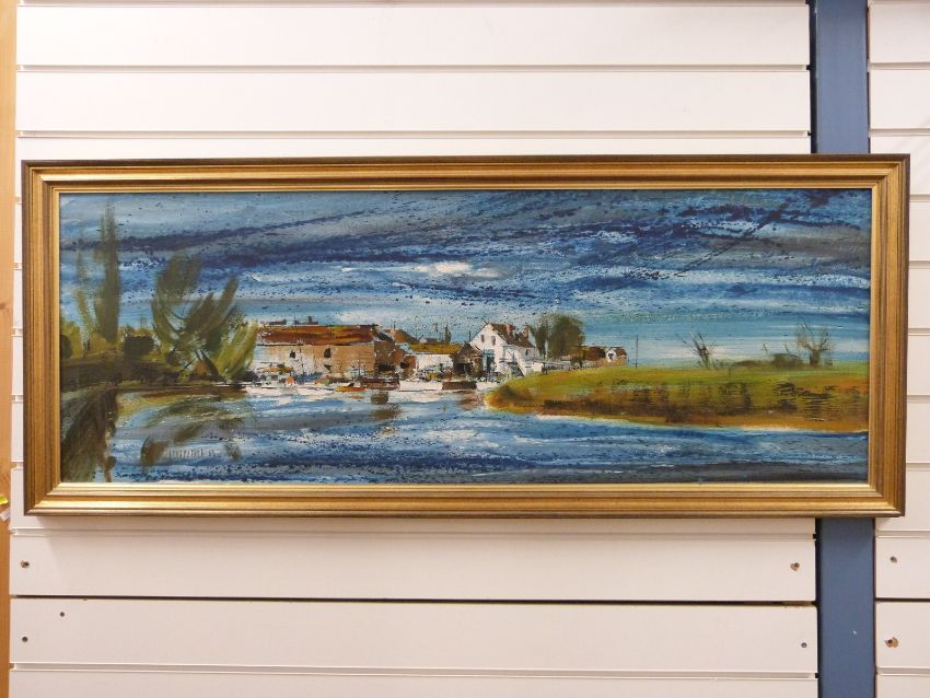 Barnfather modern oil on board of an estuary and boating scene, 43 x 119cm