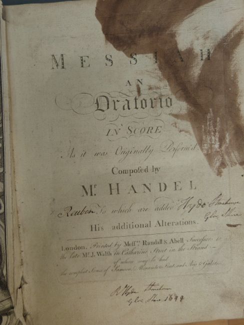 Messiah, an Oratorio in Score As it was Originally Perform'd. Composed by Mr. Handel, To which are added His additional Alterations. With an engraved portrait by J. Houbraken. Printed by Messrs Randall & Abell. (c.1699) Boards worn named inside 'Reuben Hyde, Stonehouse, Glos'shire 1699'