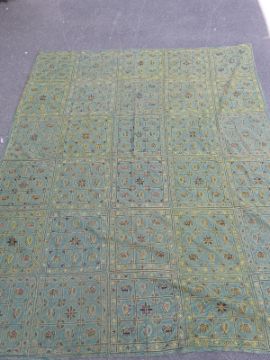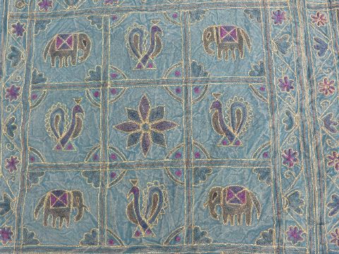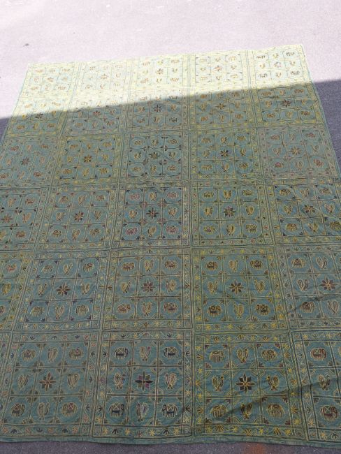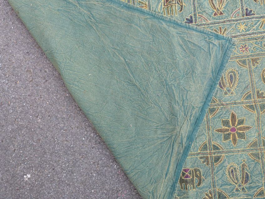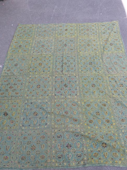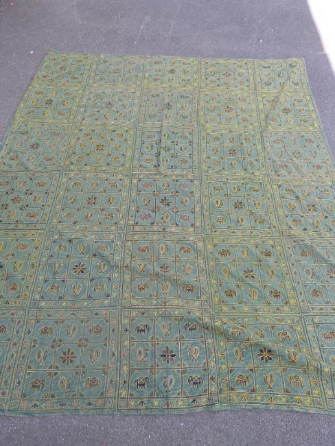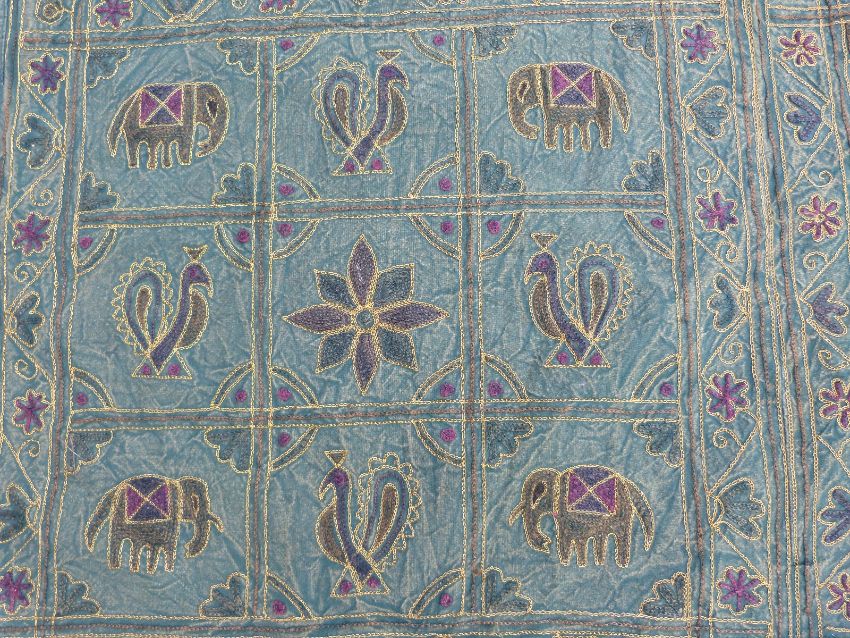 A throw or wall hanging embroidered with elephants and birds (262 x 214cm)