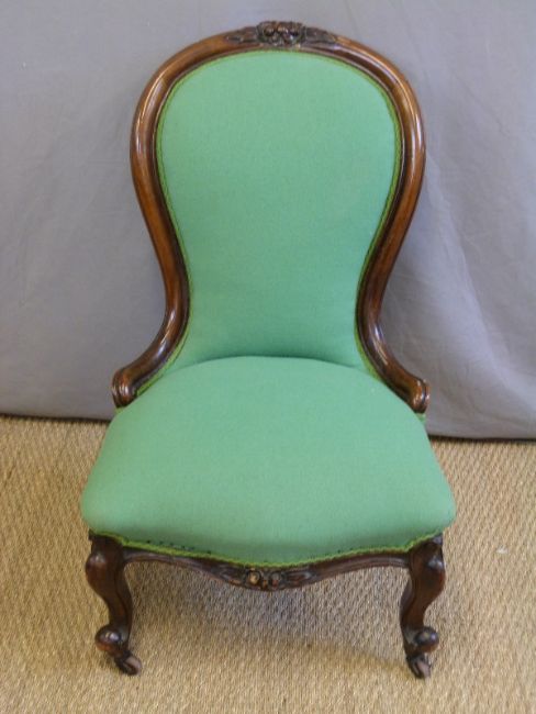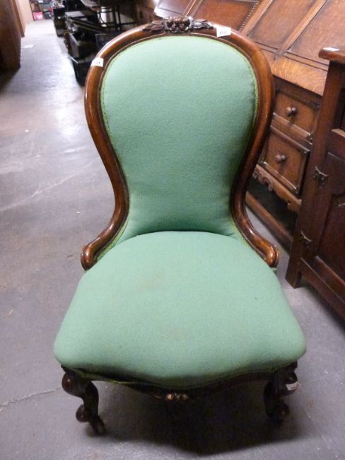 A 19thC mahogany spoon back chair with serpentine front raised on carved legs and brass castors