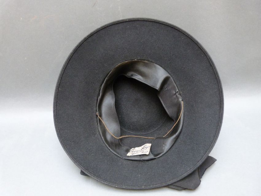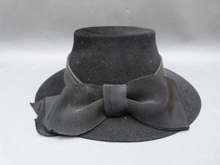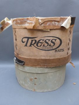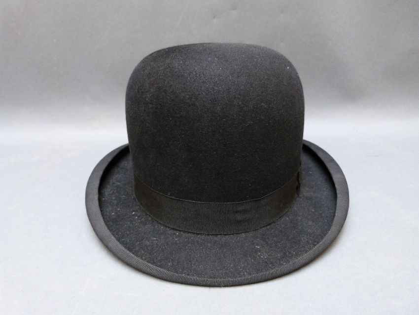 A straw boater hat with blue ribbon band 'Best English Make' size 6 7/8 together with two vintage hat boxes, a black felted Cross Keys ladies hat, and a Dun & Co bowler hat