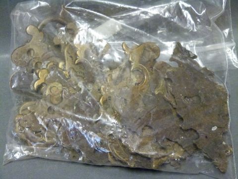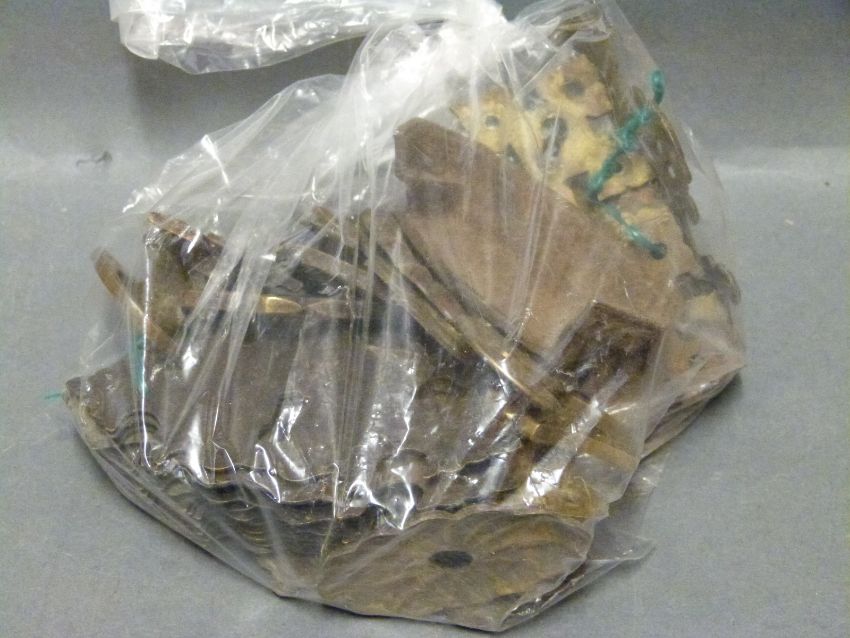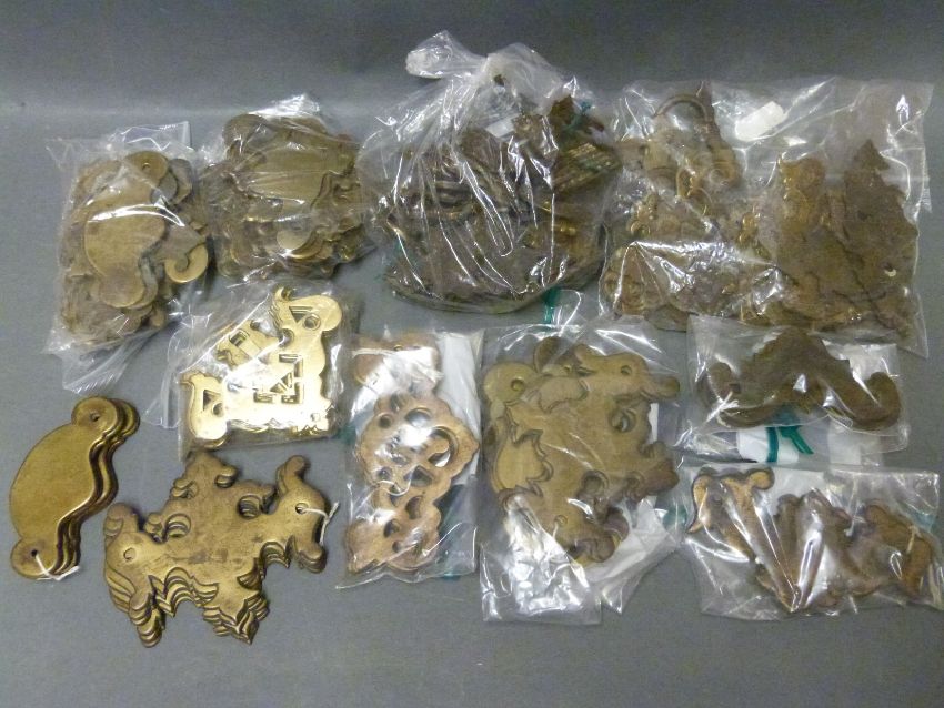Georgian, Victorian and later brass door furniture suitable for furniture restoration/cabinet making including sets/collection of looped drop handles, backplates, pierced engraved and decorative examples etc