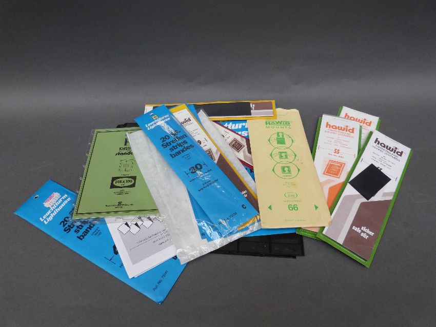 A box of sundries including catalogues, album supplements, Hawid mounts, loose stamps, GB album etc
