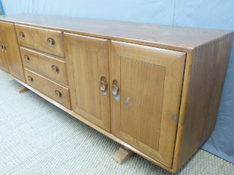 A retro Ercol light elm long sideboard with an arrangement of two double cupboards each end and bank of three straight drawers, the right hand cupboard with slide out cutlery trays, rare in this size (H75 x L218 x D44cm)