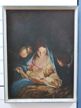 Oil on board Virgin Mary with child in the manger, signed lower right A Halnon after Carlo Maratta, 66 x 50cm