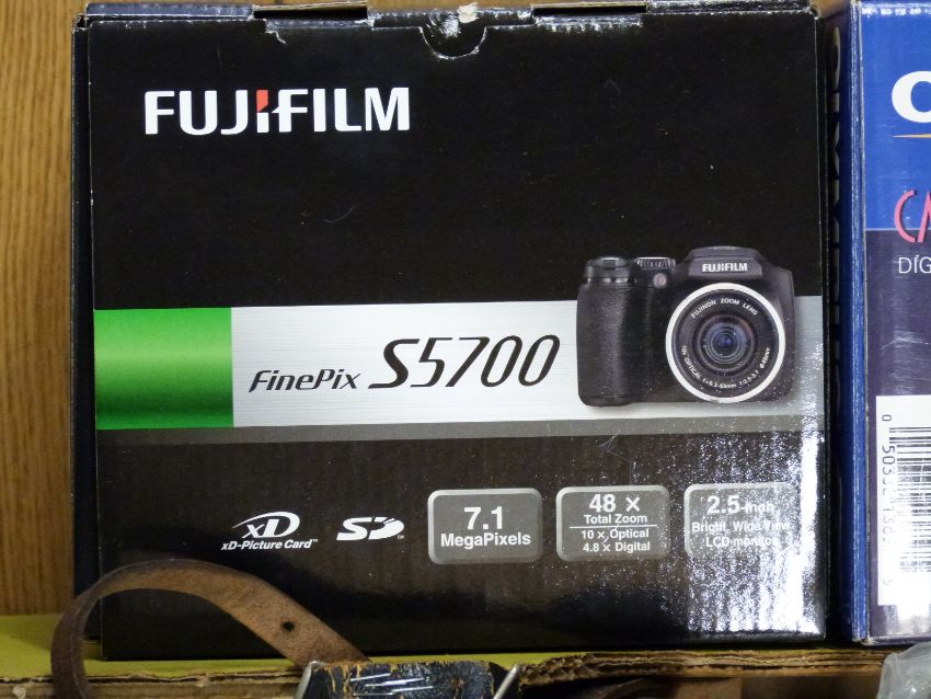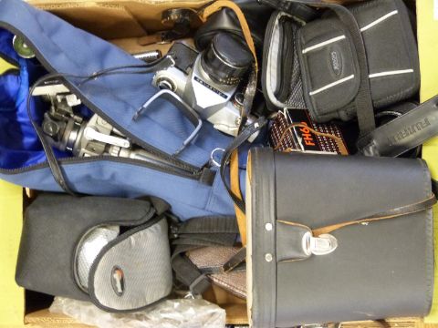 A quantity of cameras and accessories to include Olympus C-4000, Fujifilm S5700, Prinz 7x50 binoculars etc