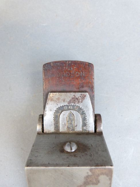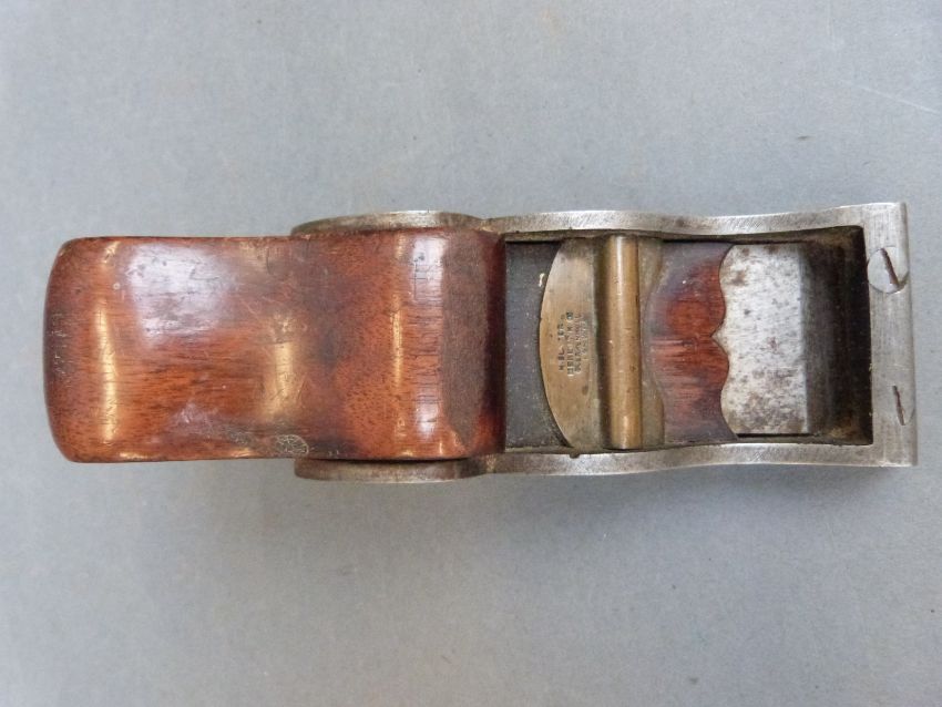 A steel Chariot plane by H Slater, Meredith Street, Clerkenwell London with mahogany handle, brass impressed nameplate and rosewood wedge, 7cm tall, 16cm long and 4.7cm wide