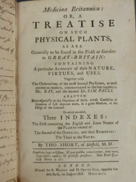 Thomas Short Medicina Britannica: or, A Treatise on such Physical Plants as are Generally to be found in the fields or Gardens in Great Britain containing a particular account of their Nature, Virtues and Uses printed for R. Manby & H. Shute Cox, 1746. Leather binding.