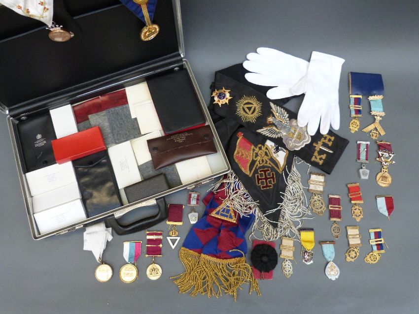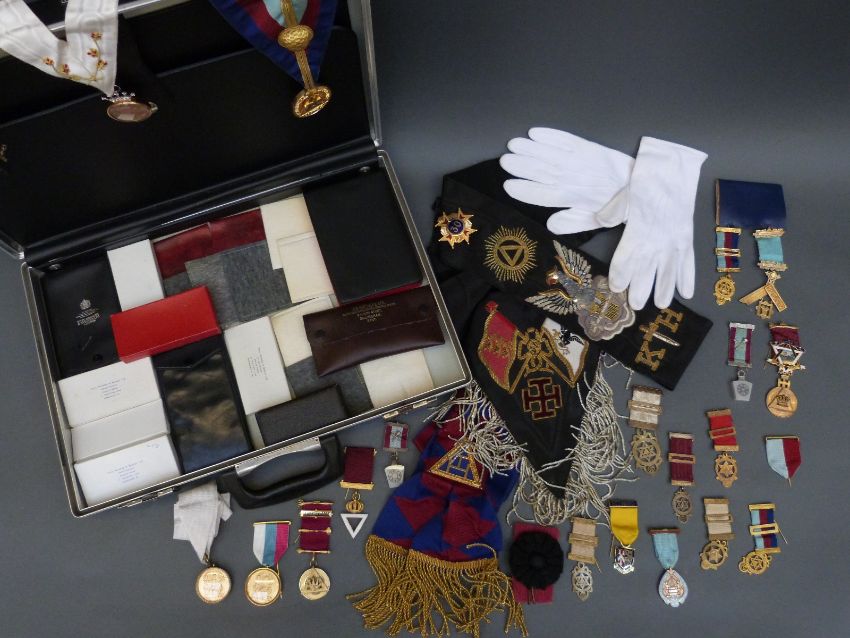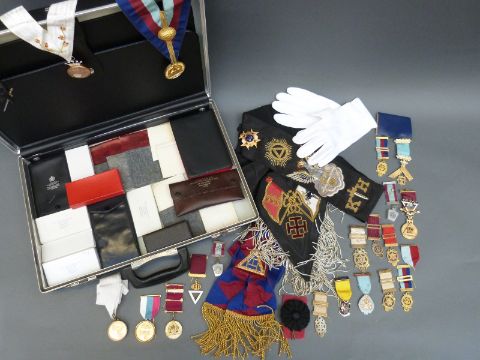 A briefcase containing a quantity of Masonic regalia including a silver gilt example, medals etc