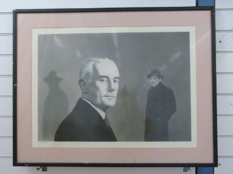 Nick Cudworth pencil and pastel on paper laid on board, head and shoulders bust of one man with another man wearing a trilby and trenchcoat beyond, signed dated March 1987 lower left, 50 x 70cm