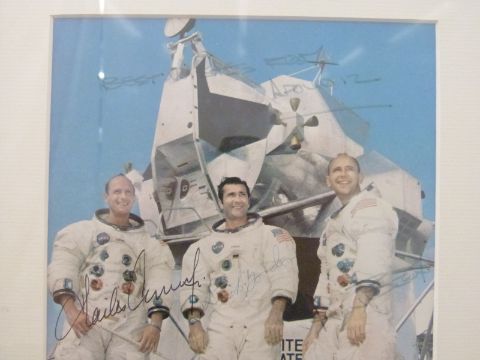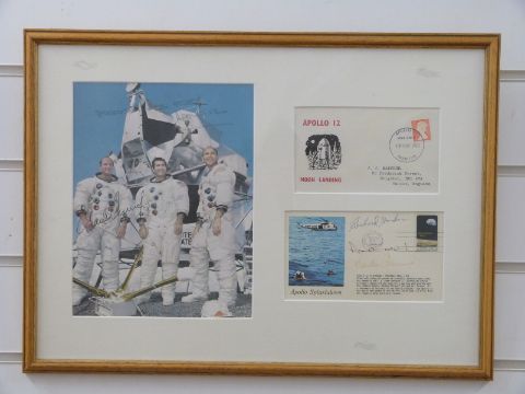 A framed Apollo 12 montage comprising picture signed by astronauts Alan Bean, Richard Gordon and Charles Conrad and similarly signed first day cover, with certificate of authenticity, 32 x 46cm