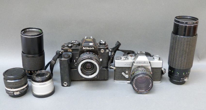 Nikon FA SLR camera with winder and fitted with 2x macro teleconverter, a Minolta SRT 201 SLR camera with Rokkor 1:1.7 f=50mm lens, Kalimar 60-300, Nikkor 24mm 1:2,8 and Tokina 1:5.6 f+300mm lenses and an Elmo 200m converter