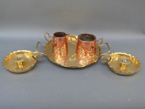 Arts and Crafts brass twin handled tray, copper jug, sucrier and a pair of brass chambersticks