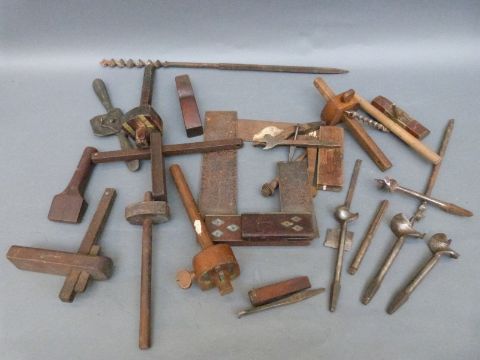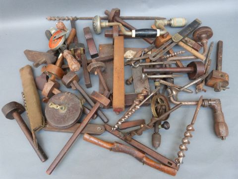 A quantity of vintage woodworking tools including squares, mortice gauges, brace and bits etc