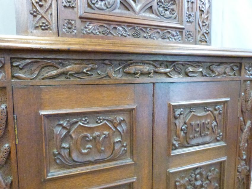 An oak Arts & Crafts corner cupboard profusely carved with flowers, foliage, lizards and 1903 date, height 188cm