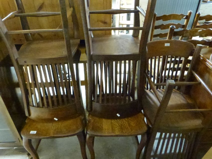 A set of six Arts and Crafts Art Nouveau oak chairs with slim split backs raised on cabriole legs