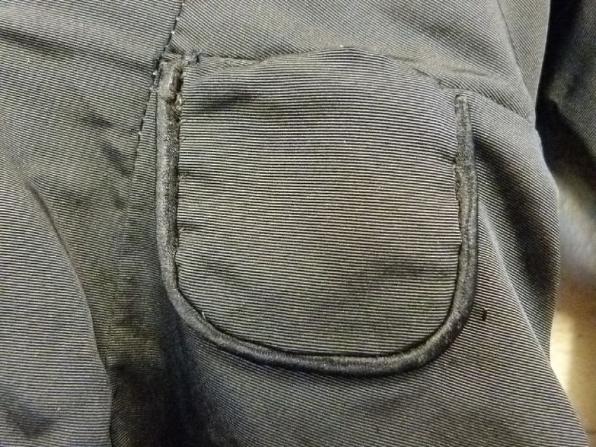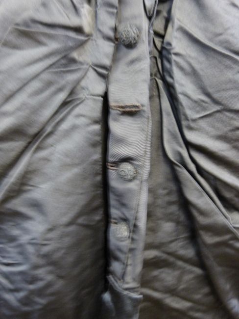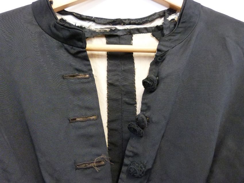 A late Victorian or early Edwardian ladies mourning dress with decorative buttons