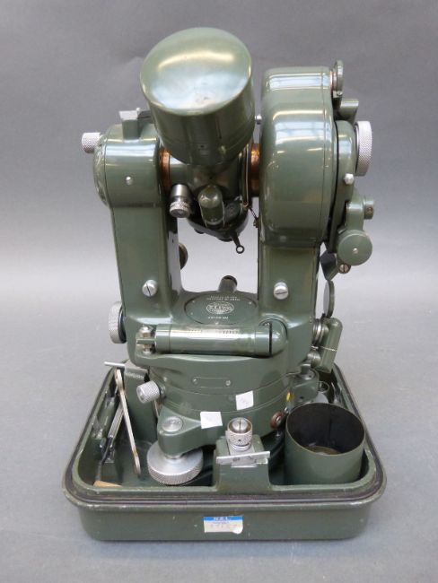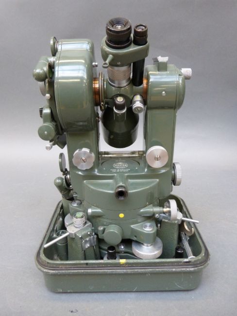 A cased Hilger Watts theodolite and wooden stand with recalibration receipt