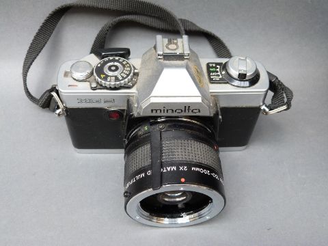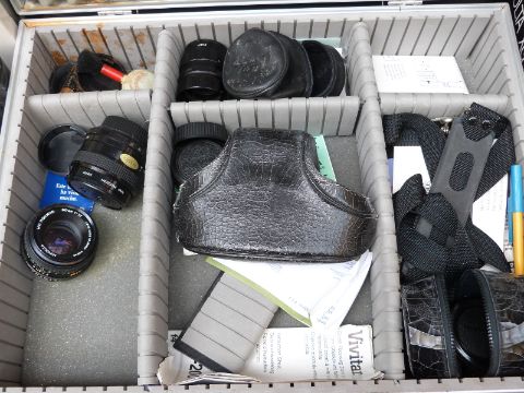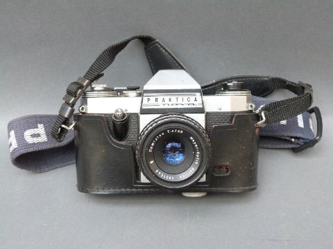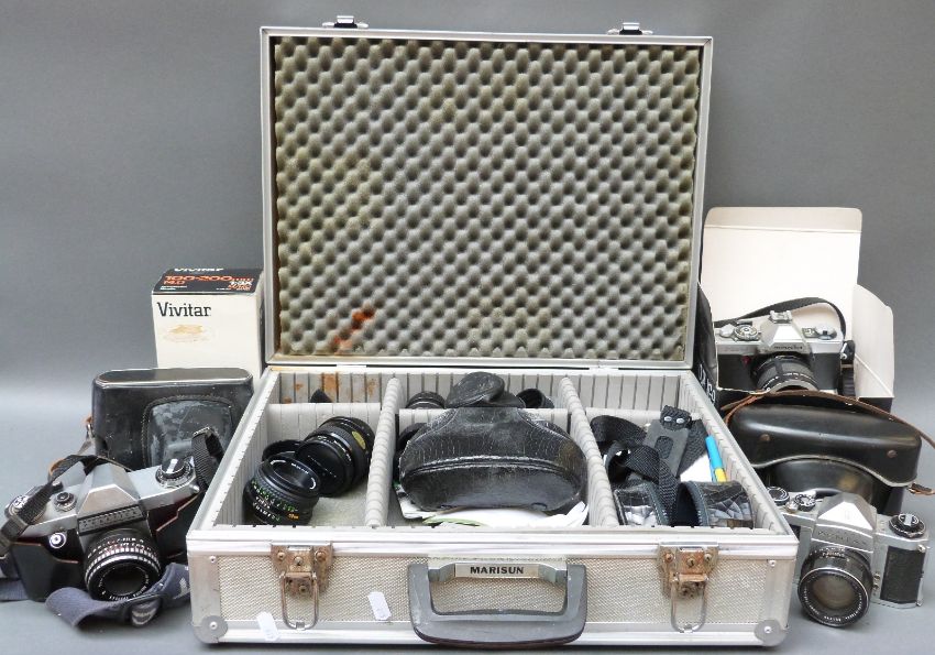 A quantity of SLR cameras and accessories to include Praktica, Minolta XG9, Zenit ET, Vivitar 100-200mm lens etc