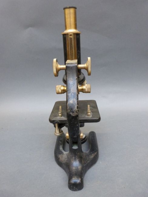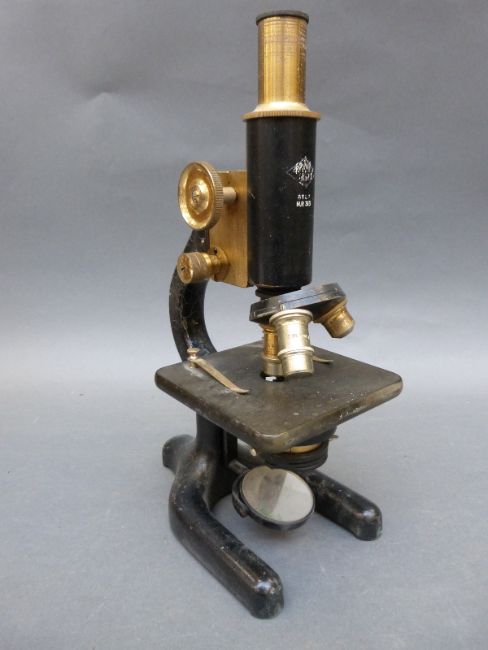 W R Prior & Co of London brass microscope in wooden box complete with lenses, stamped 8982 HP 313 to case and instrument