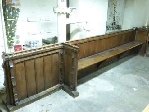 A 19thC oak church pew, ex St Bartholomew's Church, Cam, length 4m