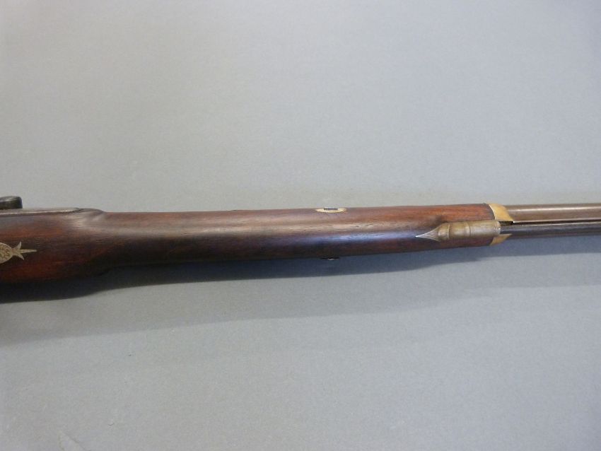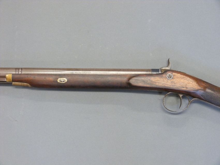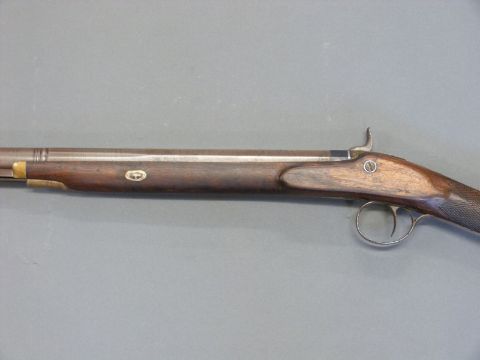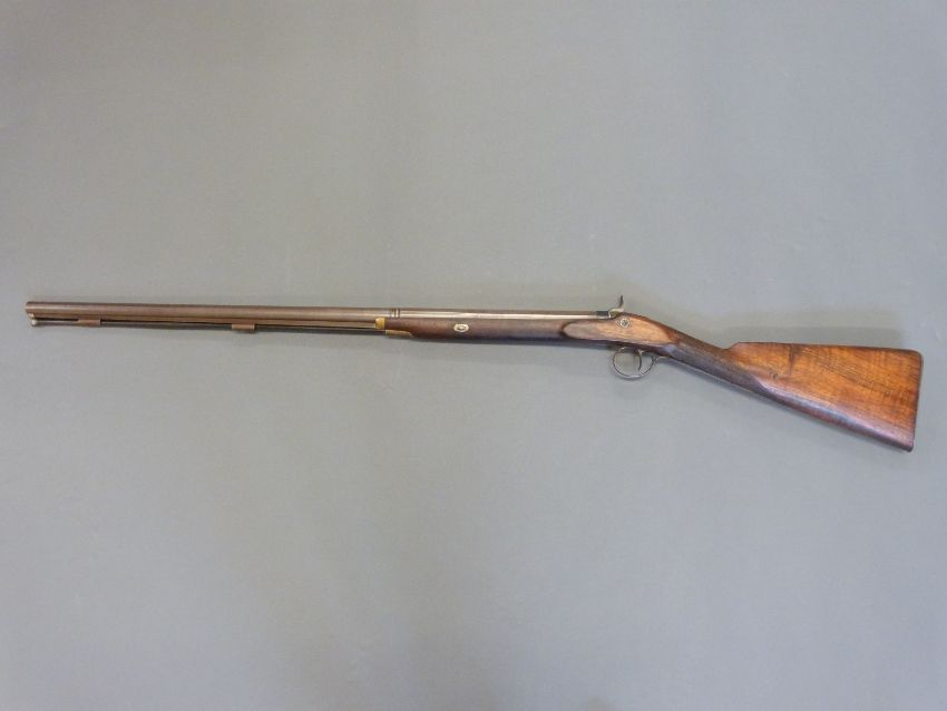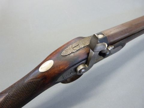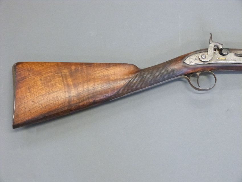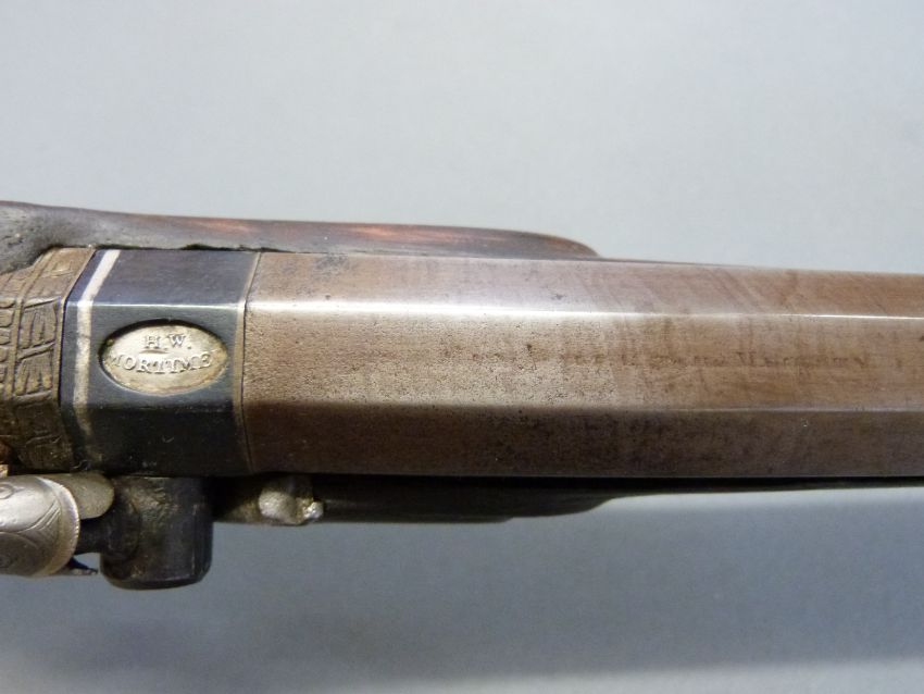 H W Mortimer 12 bore percussion hammer action gun with engraved lock, stylised dolphin hammer, top plate, butt plate and acorn finialled trigger guard, chequered grip, vacant wrist cartouche and 31 inch part octagonal Damascus smooth bored barrels with inlaid named cartouche, overall length 121cm.