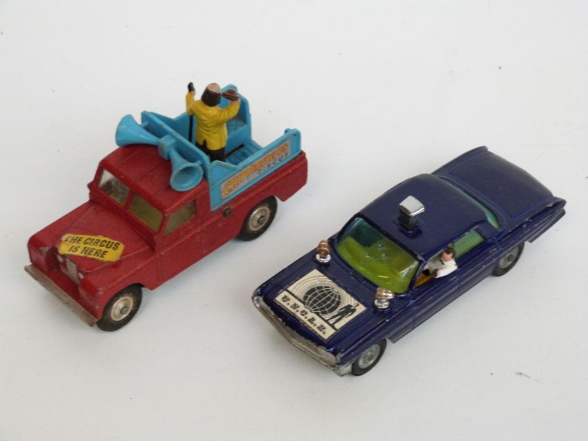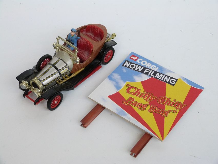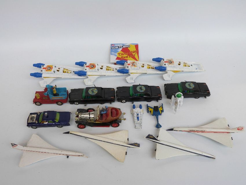 Seventeen Corgi Toys novelty, film, TV and aeroplane-related diecast model vehicles including Chipperfields Circus, Chitty Chitty Bang Bang, Green Hornet, Buck Rogers Star Fighter etc