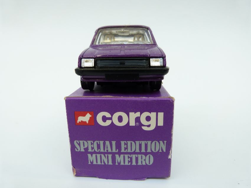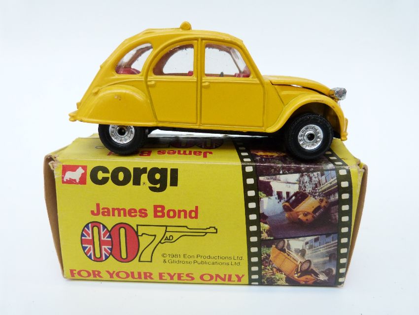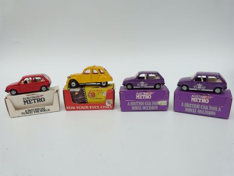 Six Corgi Toys diecast model vehicles comprising James Bond 007 For Your Eyes Only Citroen 2CV, special edition Austin Mini Metro, Austin Metro, Roadworks Land Rover, Special Edition Royal Mini Metro and Corgitronics electronic Beep Beep London Bus 1004, all in original boxes