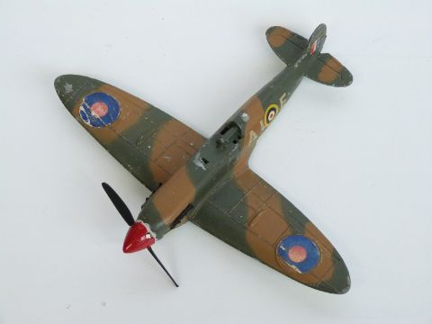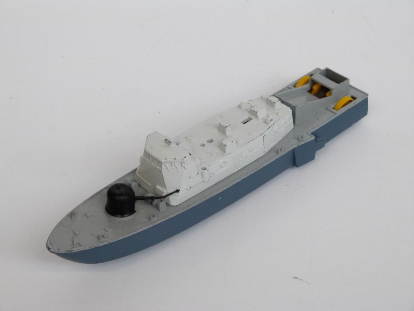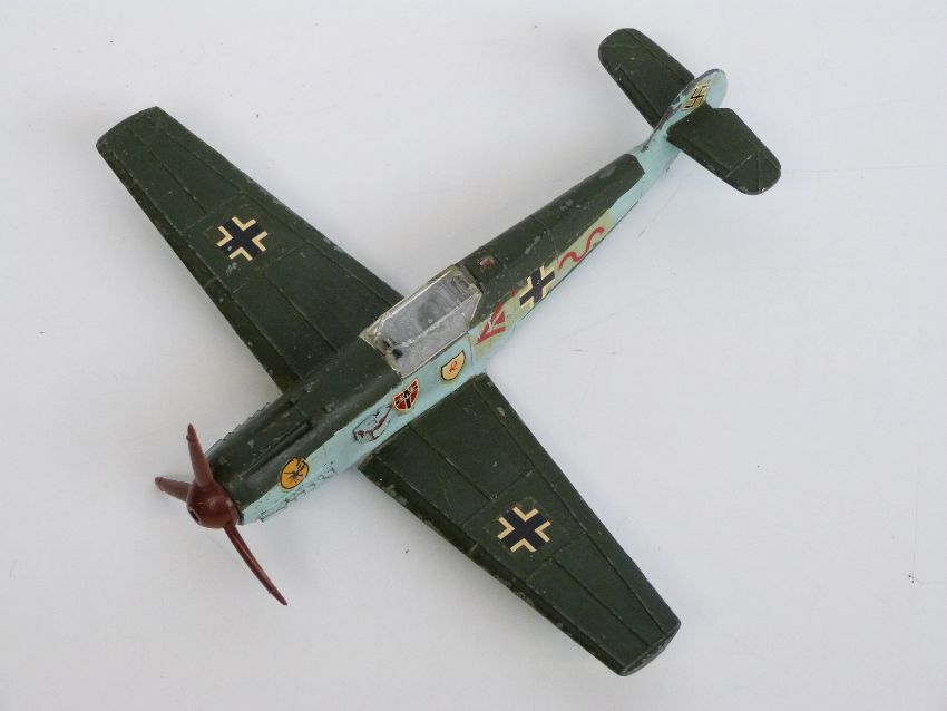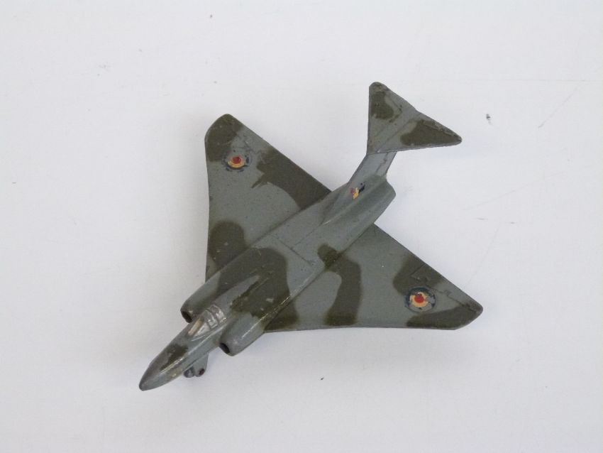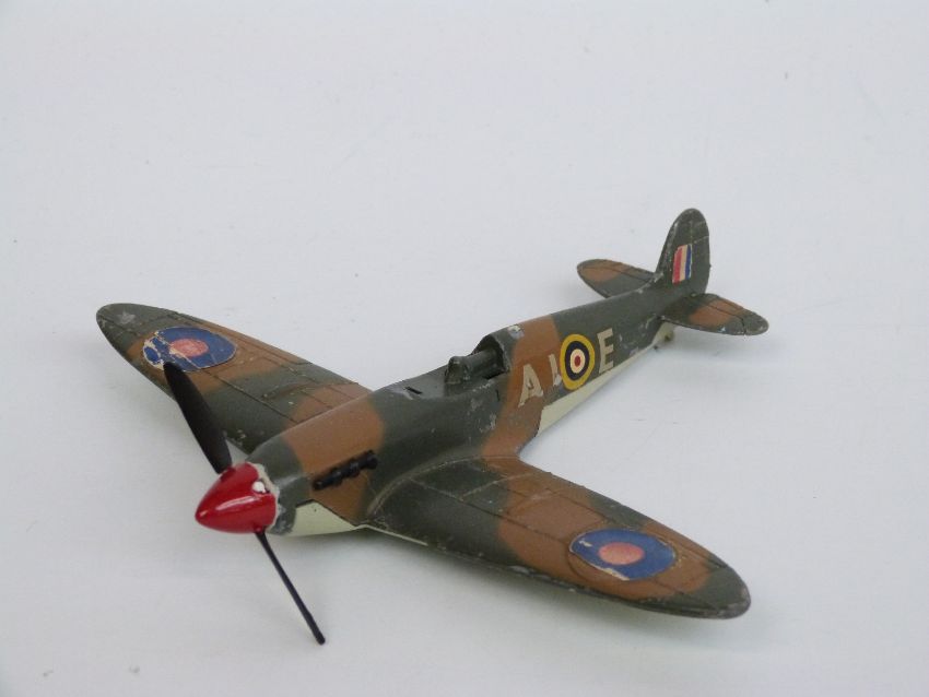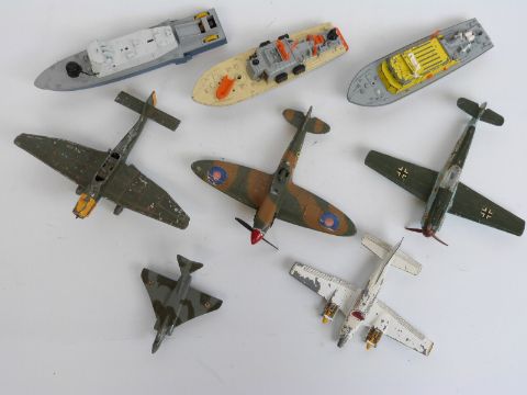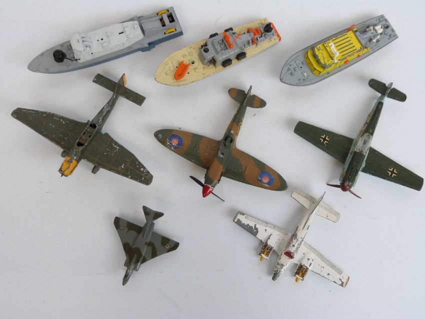 Eight Dinky Toys diecast model aeroplanes and boats, some military including Spitfire MKII, Submarine Chaser etc