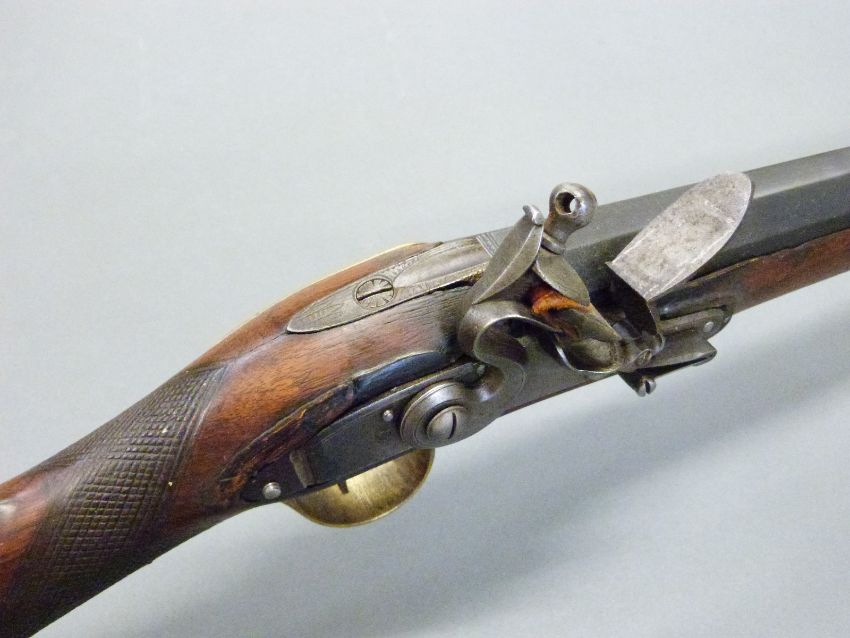 Halliday & Biddle 12 bore flintlock hammer action gun with named and line engraved lock, horn tipped forend brass mounts, engraved and acorn finialled trigger guard, bird scenes engraved to the butt plate and 48.5 inch part octagonal barrel, overall length 162cm.
