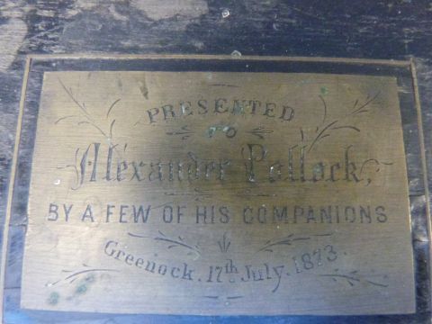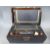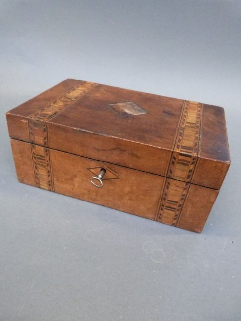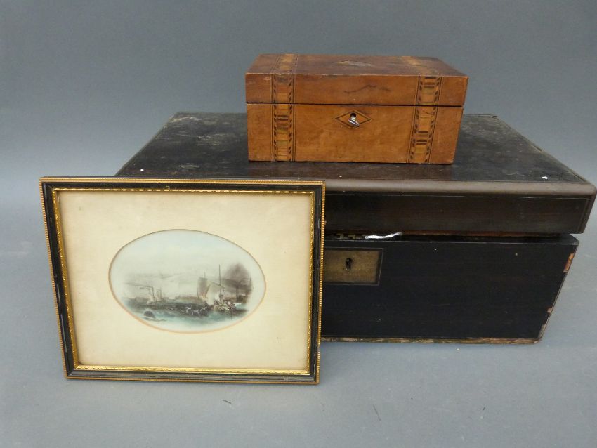 A Victorian brass bound and inlaid writing slope dated 1873, a wooden box and framed print