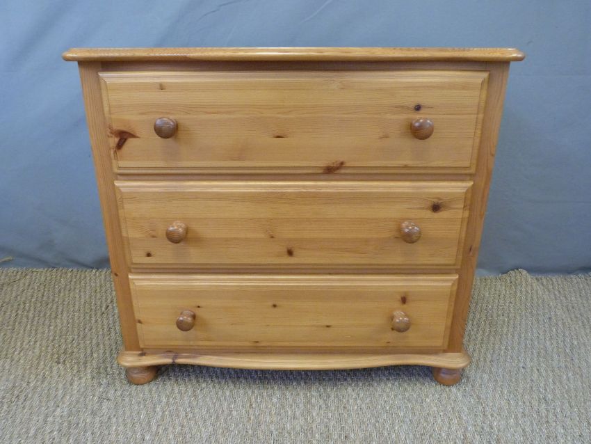 A serpentine topped pine chest of three drawers, W79 x D49 x H71cm