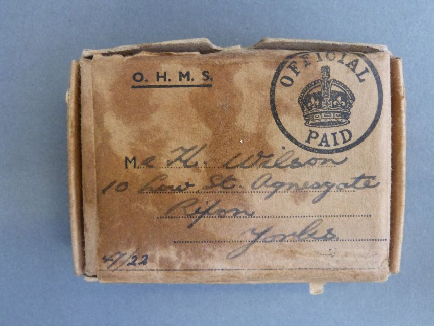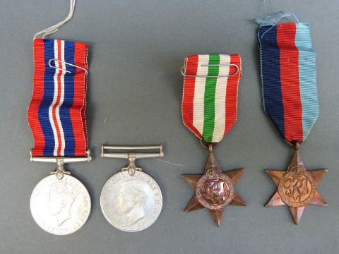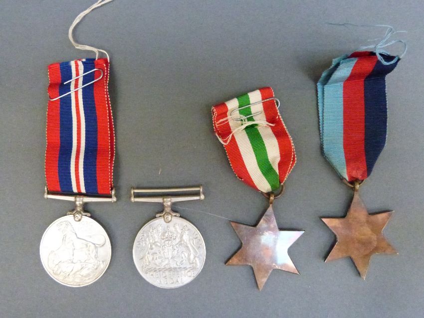 A boxed set of four WWII medals comprising 1939-45 Medal, defence medal, Italy star and 37-45 star, in box addressed to Mr H Wilson Ripon, Yorks and two 1930's Coldstream Guards interest paper items relating to Ambrose Edward Ransome
