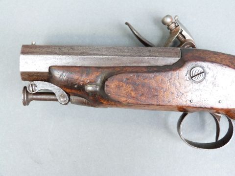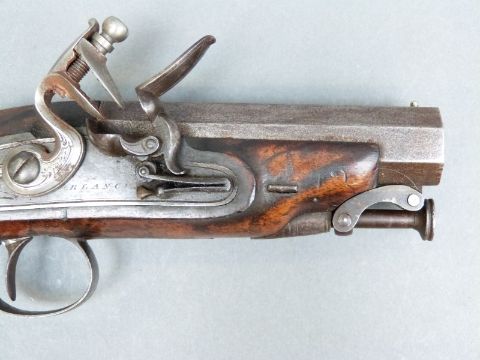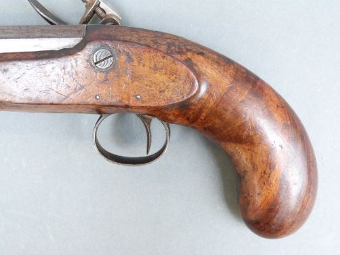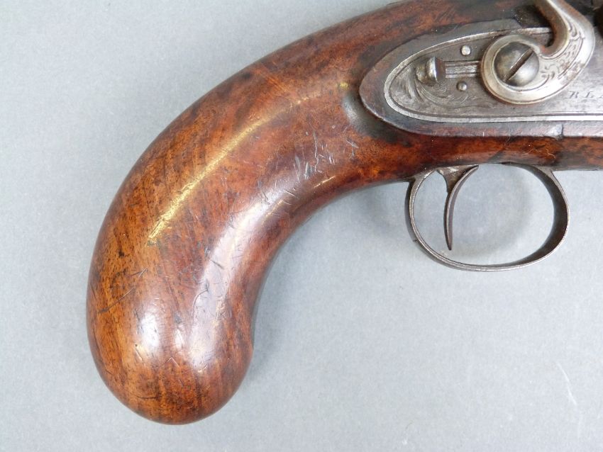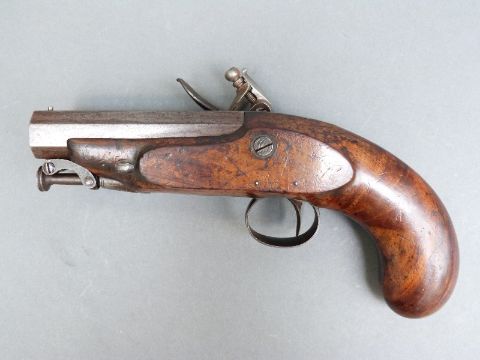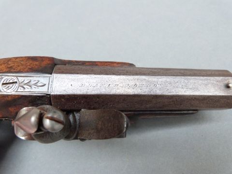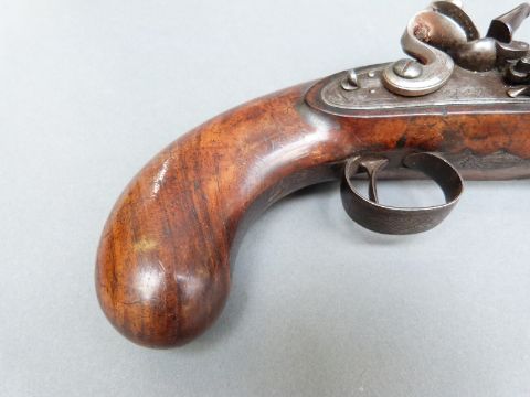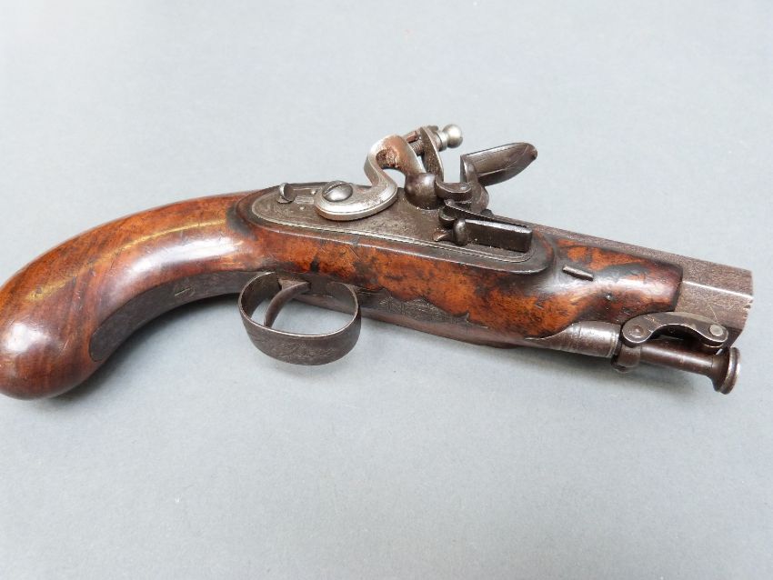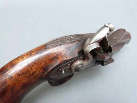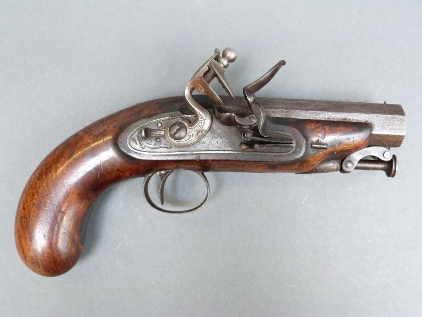 John Blanch of London 18 bore flintlock hammer action pistol with named and engraved lock and hammer, walnut stock, feather engraved top plate, engraved pineapple finialled trigger guard, captive ram-rod and 3.7 inch octagonal smooth bored barrel engraved 'Blanch London', overall length 22cm.