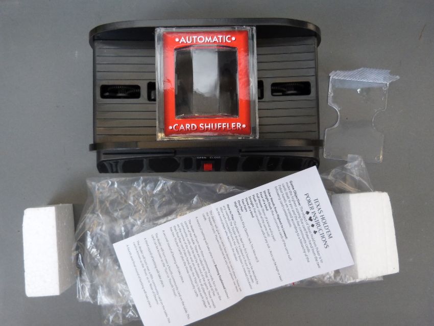 A quantity of boxed card shuffling machines, poker / bridge interest