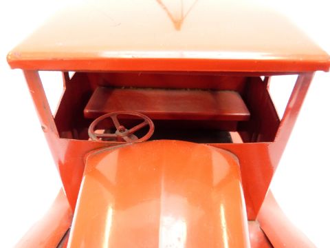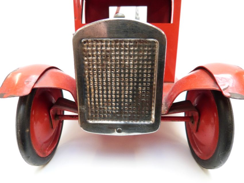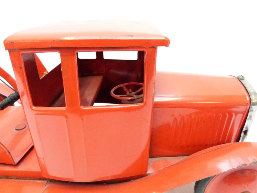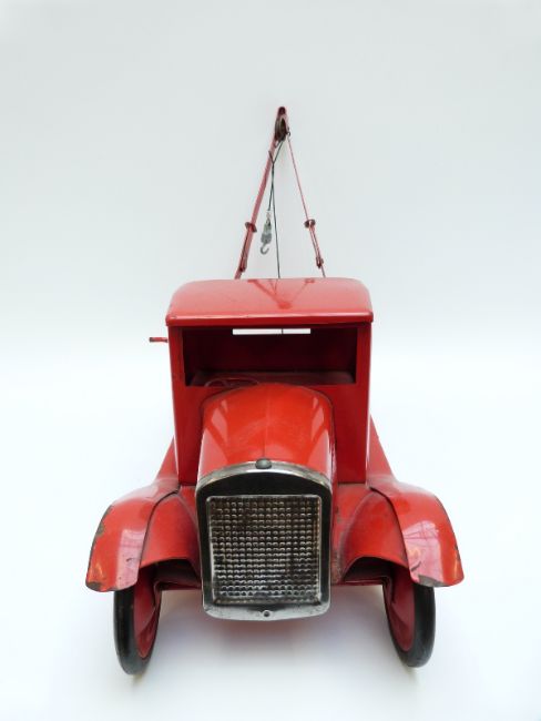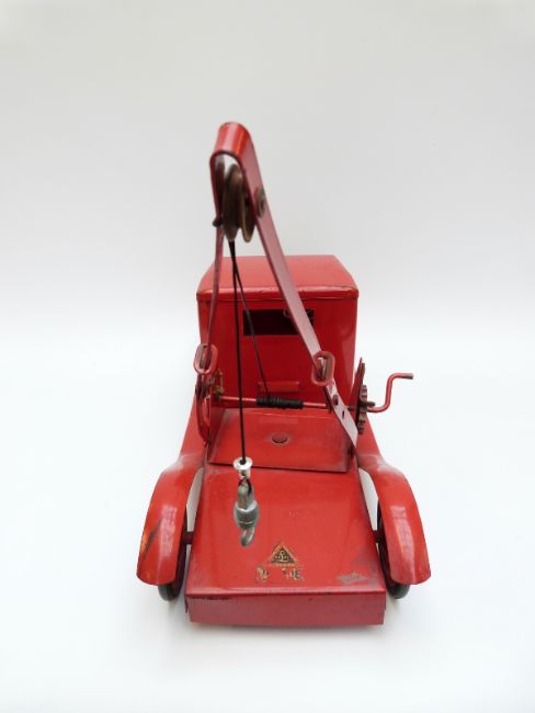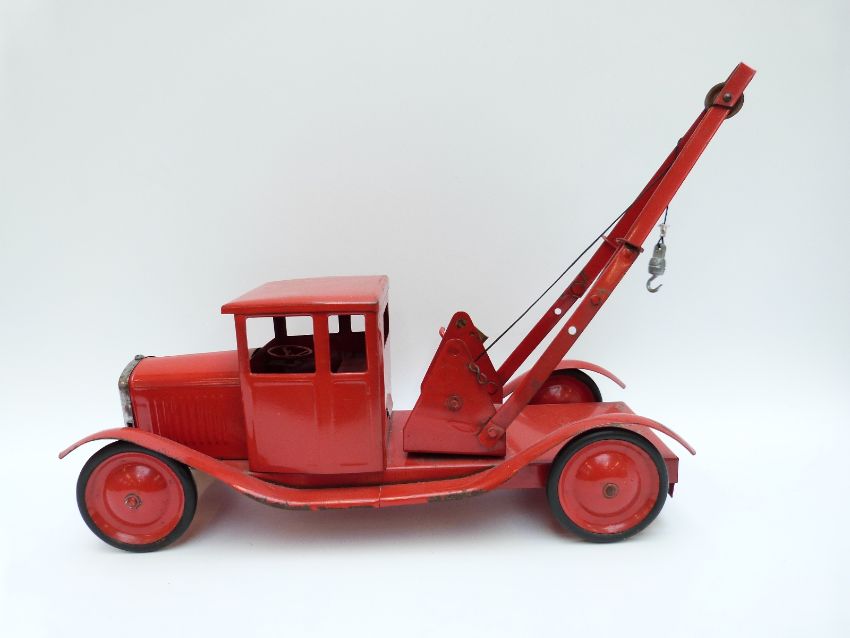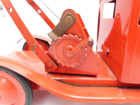 Tri-ang large scale pressed steel recovery truck with red body and wheels, 43cm long
