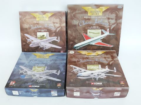 Four Corgi The Aviation Archive 1:144 scale diecast model aeroplanes Frontier Airlines BOAC Aero York 47202 and BOAC Avro Lancastrian 47402, Classic Jetliners BEA DH Comet 4B 48501 and Berlin Airlift Flight Refueling Ltd Avro Lancastrian 47403, all in original boxes