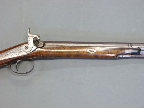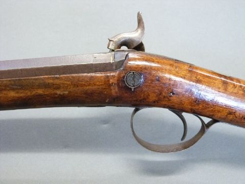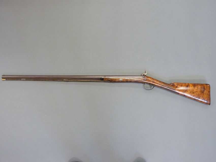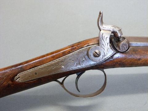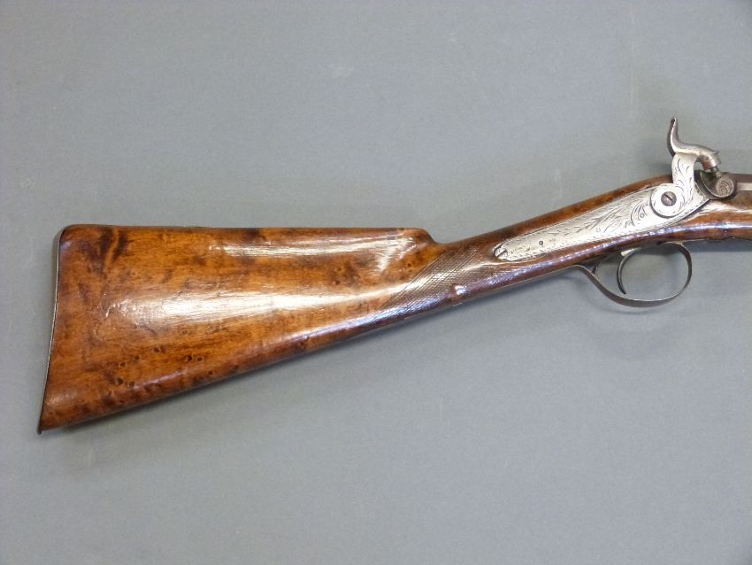 30 bore percussion hammer action gun with engraved lock and stylised dolphin hammer, chequered grip, acorn finialled trigger guard, engraved butt plate, brass tipped wooden ram-rod and 33 inch part octagonal Damascus barrel, overall length 122cm